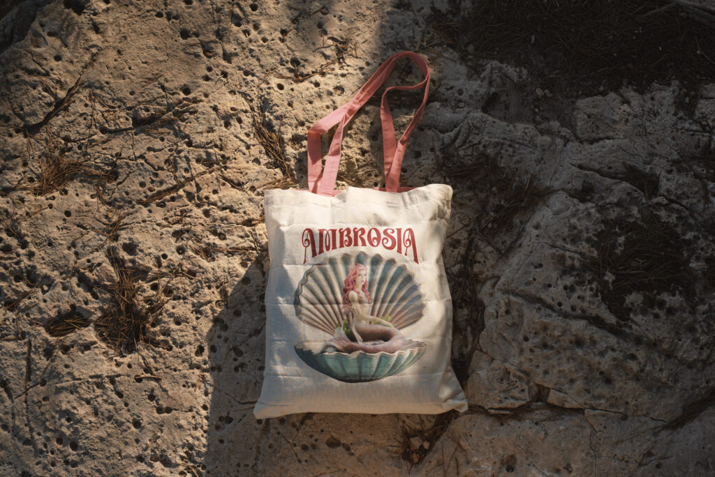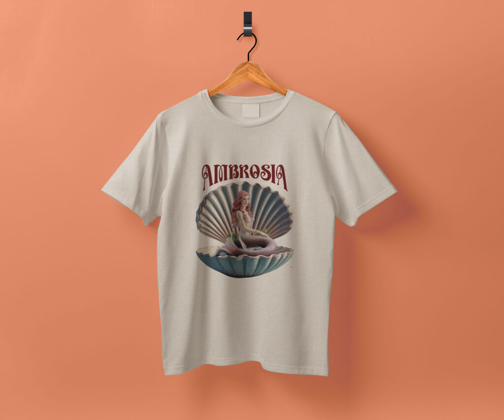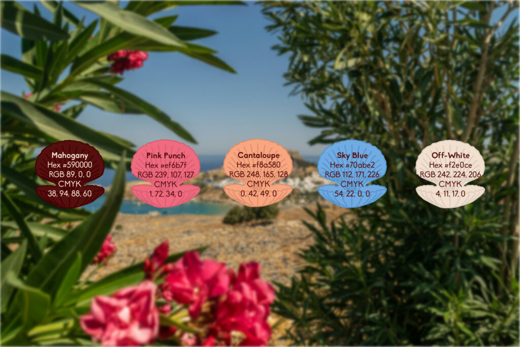 The mermaid sitting in a shell, the typography, and the color palette all follow the theme of Greek mythology, summer, whimsy, and wonder. The font featured in the logo is the swirly yet bold font reflecting the whimsical nature of the mermaid emerging from the sea on a shell.