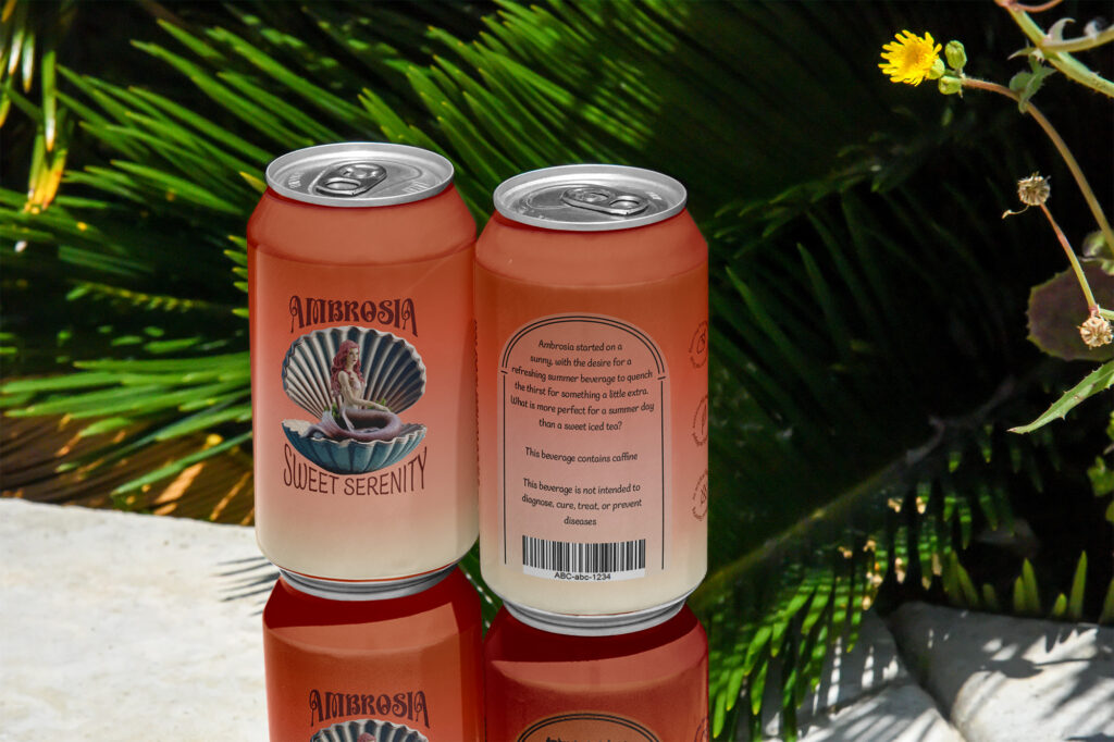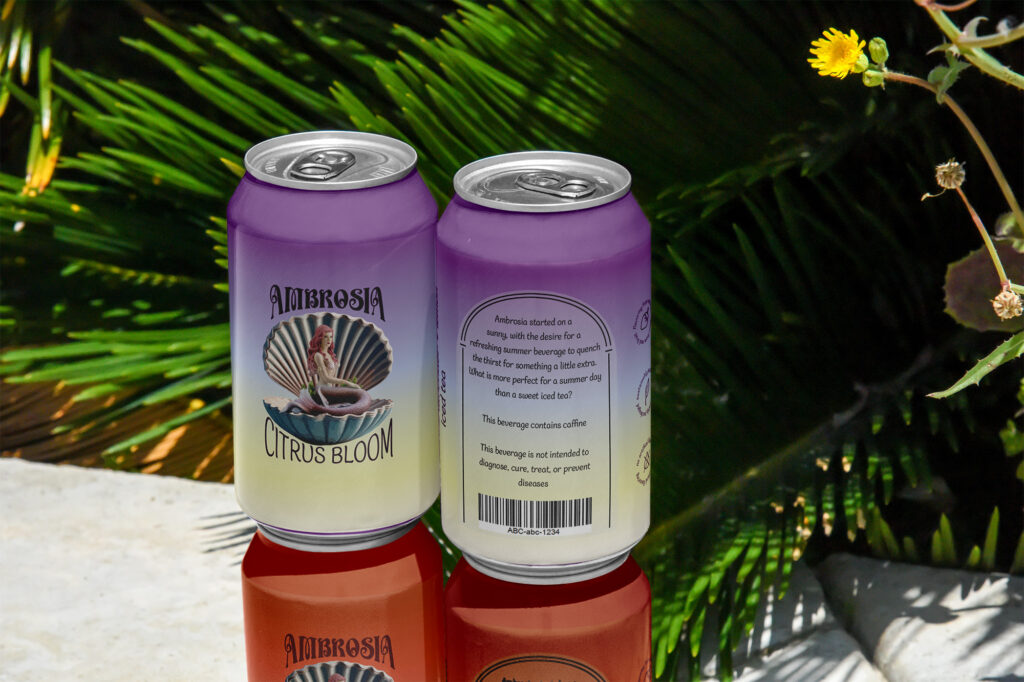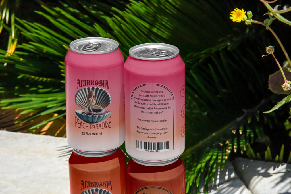 Ambrosia started on a sunny day, with the desire for a refreshing summer beverage to quench the thirst for something a little extra. What more perfect for a summer day than a sweet iced tea? Sustainably packaged and made with no desire for artificial sweeteners or artificial flavors. Inspired by both the tea Ambrosia and the Greek term for the drink of the gods. Ambrosia is not just tea, but an experience and art in a can. Perfect for the summer, whether you just need a drink on a hot day, to relax after your day, or to savor the moment.