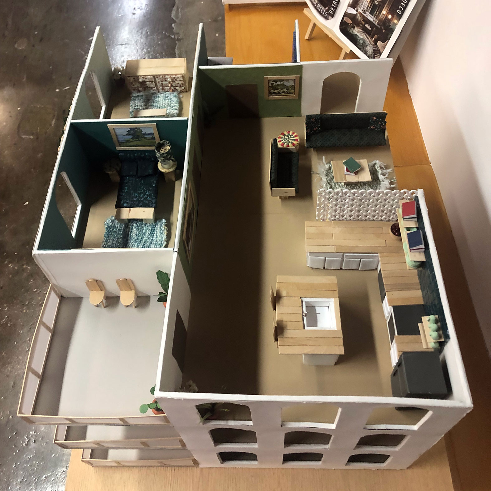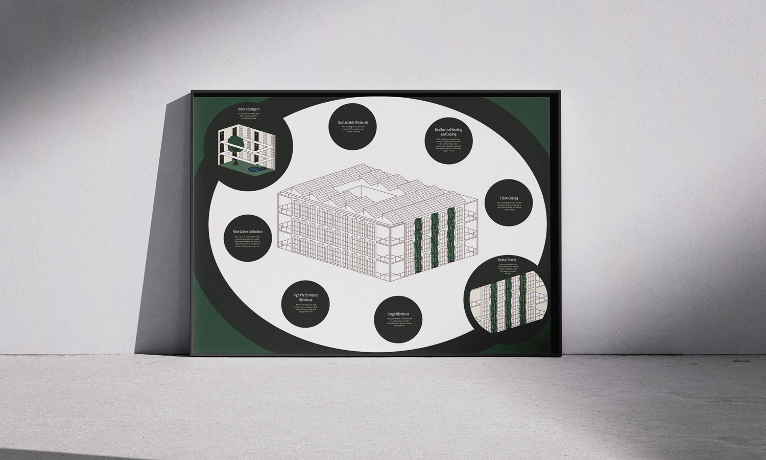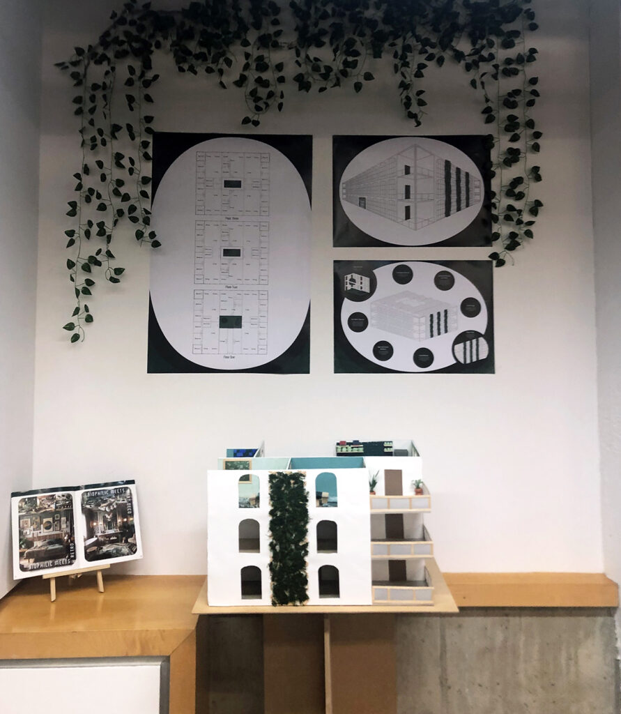 Urban Oasis is a glimpse into a green future, asking, “What if all our buildings, public, commercial, and residential, were green buildings to combat climate change and create simpler living?” Following the direction of already established ideas in green architecture and biophilic design, Urban Oasis focuses on the possibility of an entirely green future. These green concepts are rooted in the visual identity and are integrated throughout the architectural drawings and a model of a green residential building, immersing the viewer in an urban oasis. The cohesive visuals create a sense of peace and balance, while inspiring us to reconnect and give back to nature.