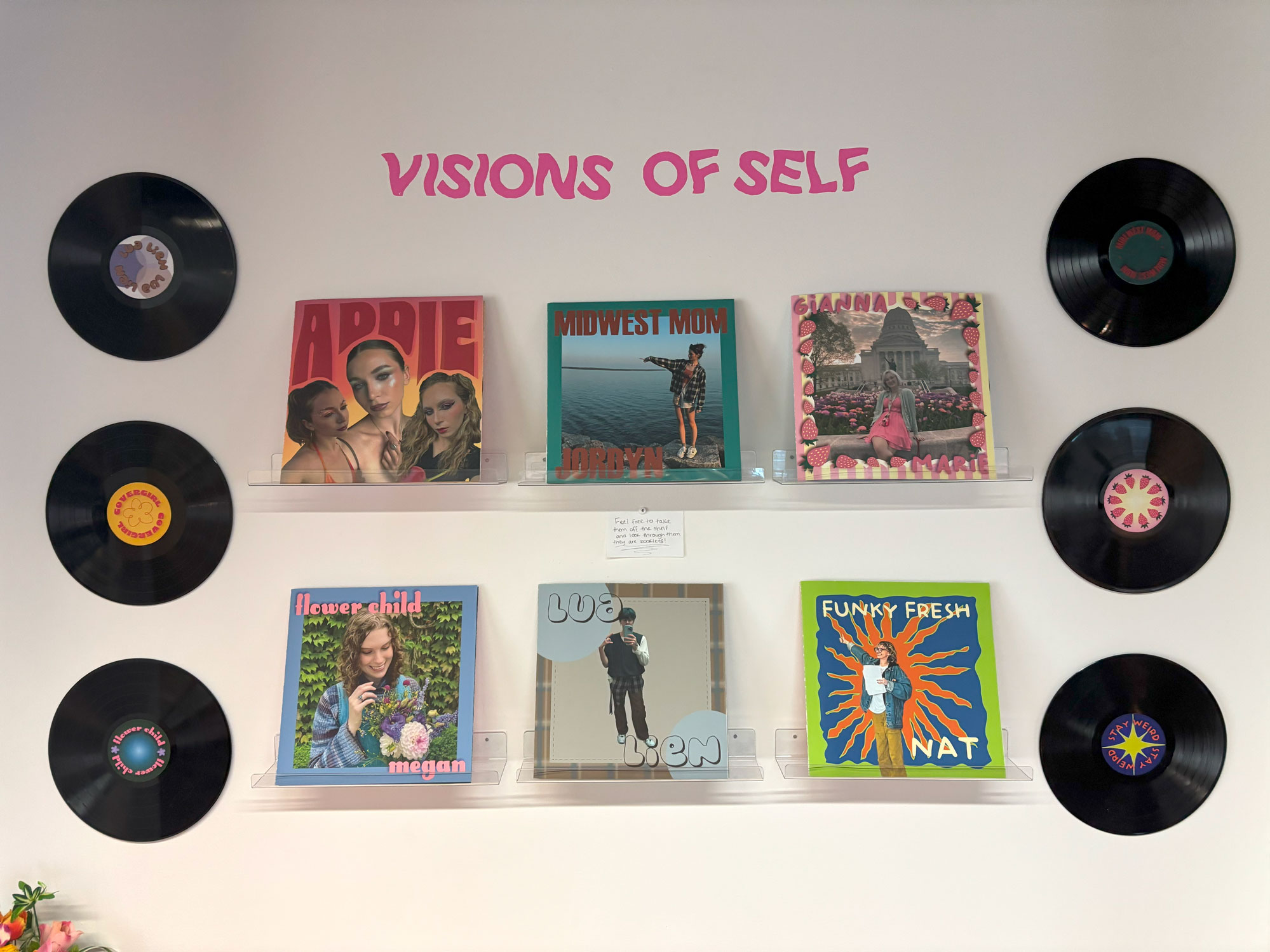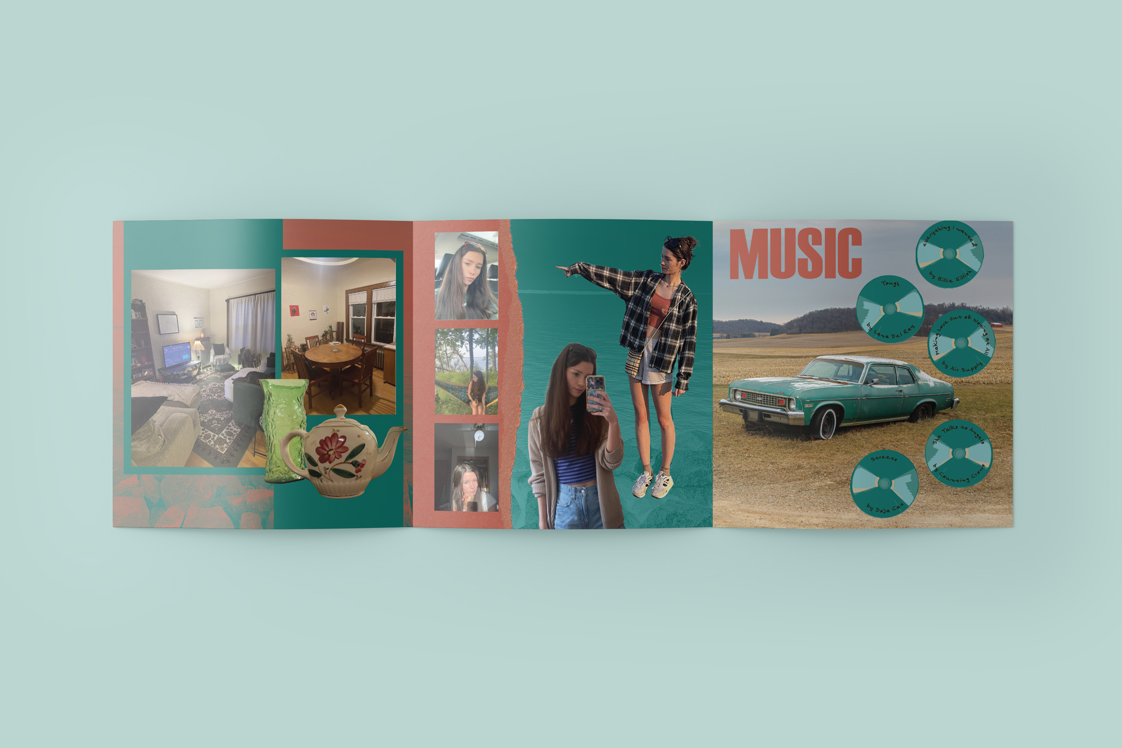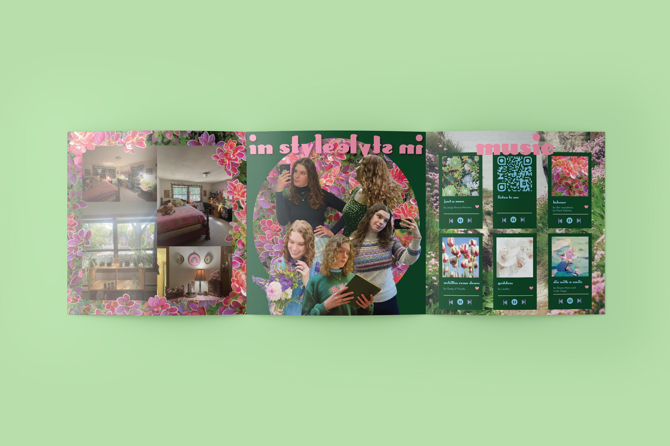NoSignal! A Community Exhibition explores community in a digital age, offering a way for us as designers to connect with the world.  Visions of Self brings together a community of creatives who communicate their identity through fashion, makeup, music, and interior design. This idea is expressed through a universal medium: music albums. These albums are booklets that open up to reveal each person’s individual style; each booklet is unique to the person it is about, from the imagery down to the color palette and typography. Each album opens up a world of community through finding others with similar tastes, all while promoting human connection.
