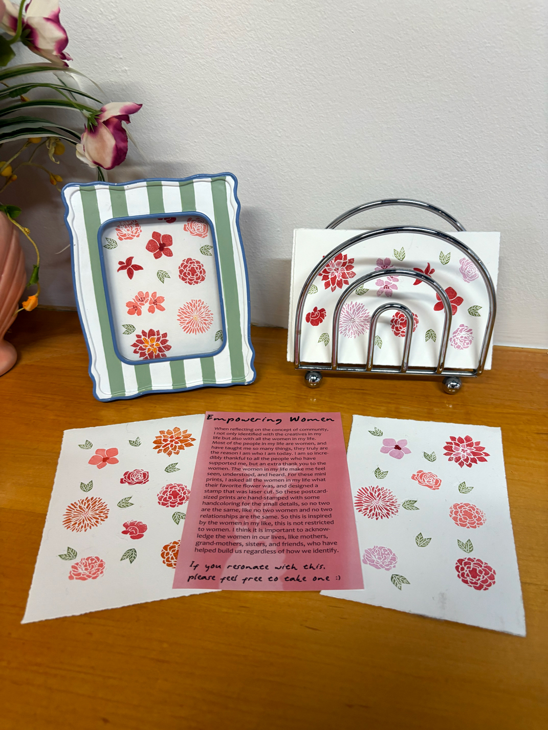 The flower postcards are digitally designed, laser cut, and hand-stamped. The flowers chosen are the favorite flowers of the women in my life, and pay homage to them, as my original community idea was women supporting women. Each postcard is unique with different colors and compositions, just like each flower is unique.