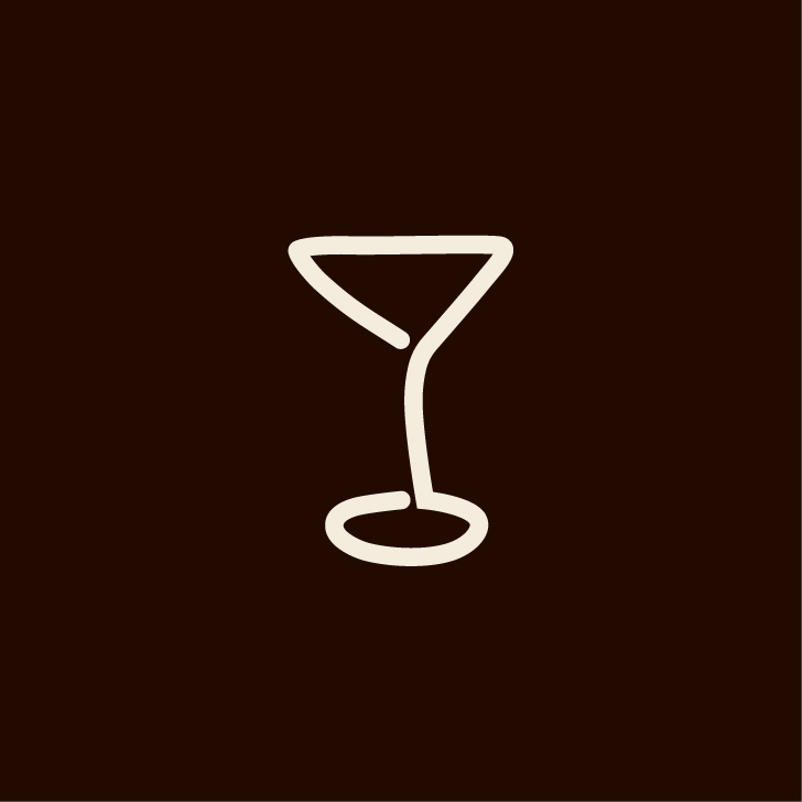 The logo mark features a custom font to effectively evoke a glamorous feeling with a Didone font to match the overall visual aesthetic. The full brand includes four logos, each for a different purpose, and icons of a coffee mug, a to-go cup, and a martini glass symbolizing the variety of drinks one can order.