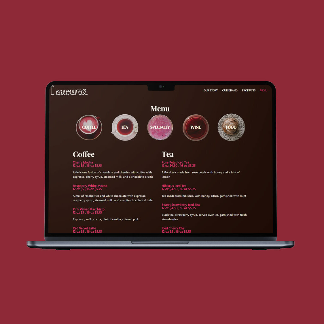 The primary high-contrast colors, dark coffee brown and white, aid the feeling of glamour, referencing a modern take on The Great Gatsby. To contrast these two colors and bring the playful feel back in are various shades of red and pink, including a wine red shade and a lighter taupe color, to pull all the colors together.